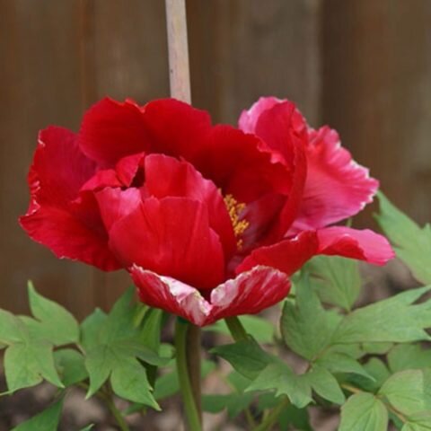 Пион встречается также под названием Красно-Белый. Обладает достаточно компактными размерами, имеет крепкие густо облиственные стебли.
